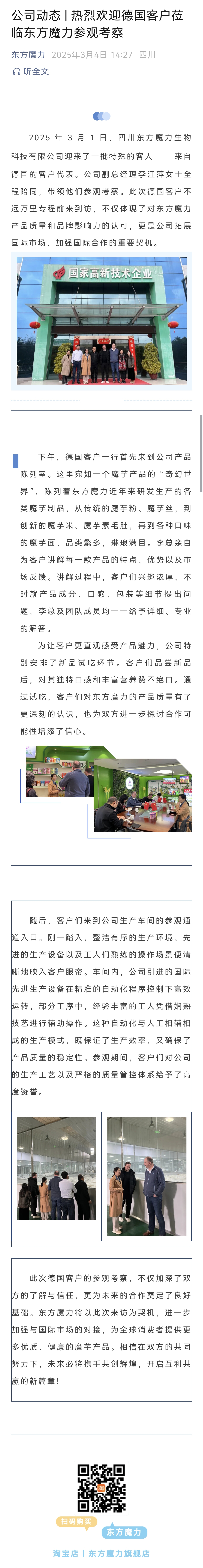 2025 年 3 月 1 日,四川东方魔力生物科技有限公司迎来了一批特殊的客人 ——来自德国的客户代表。公司副总经理李江萍女士全程陪同,带领他们参观考察。此次德国客户不远万里专程前来到访,不仅体现了对东方魔力产品质量和品牌影响力的认可,更是公司拓展**市场、加强**合作的重要契机。